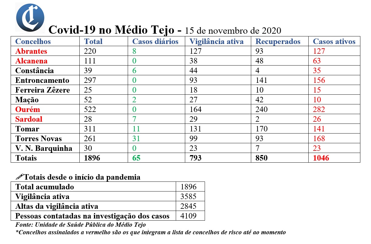 Por concelhos, os números totais no Médio Tejo desde o início são os seguintes: Abrantes (220 casos – 93 recuperados); Alcanena (111 – 48 recuperados); Constância (39 casos – 4 recuperados); Entroncamento (297 – 141 recuperados); Ferreira do Zêzere (25 – 10 recuperados); Mação (52 – 42 recuperados); Ourém (522 –240 recuperados); Sardoal (28 – 2 recuperado); Tomar (311 – 170 recuperados); Torres Novas (261 – 93 recuperados); Vila Nova da Barquinha (30 – 7 recuperados).