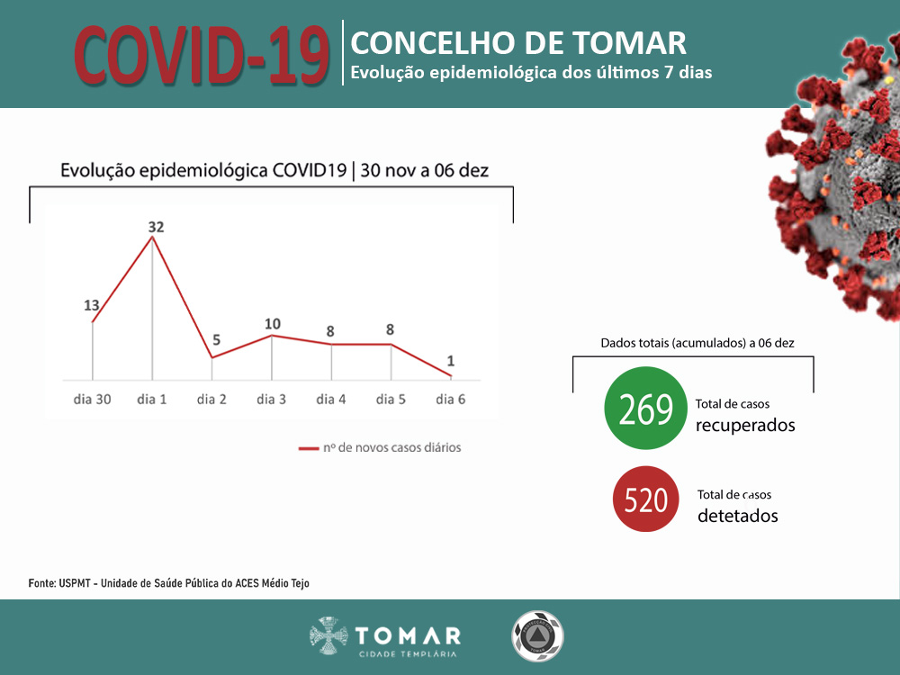 De acordo com os dados enviados pela USPMT – Unidade de Saúde Pública do ACES Médio Tejo, Tomar tem a registar, na última semana, 77 novos casos, dos quais 29 foram resultado do rastreio efetuado na cidade pelo Camião da Esperança nos dias 30 novembro e 1 de dezembro. Existem atualmente 134 casos em vigilância ativa.
