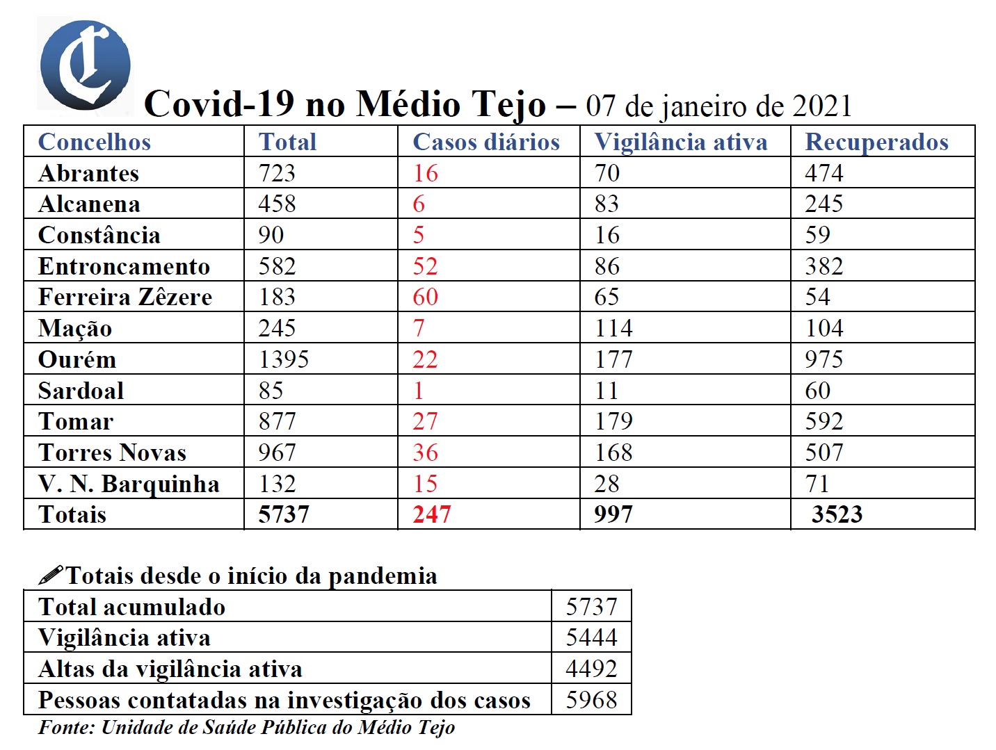 Na quinta feira, dia 7 de janeiro, registaram-se mais 247 novos casos de Covid-19, atingindo um total de 5737 casos desde o início da pandemia. Os 247 casos das últimas 24 horas estão registados em Abrantes (16), Alcanena (6), Constância (5), Entroncamento (52), Ferreira do Zêzere (60), Mação (7), Ourém (22), Sardoal (1), Tomar (27), Torres Novas (36) e Vila Nova da Barquinha (15). O total de recuperados é de 3523.