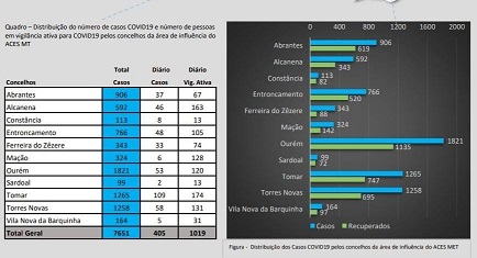 Por concelhos, os números totais no Médio Tejo desde o início são os seguintes: Abrantes (906 casos – 619 recuperados); Alcanena (592 – 343 recuperados); Constância (113 casos – 82 recuperados); Entroncamento (766 – 520 recuperados); Ferreira do Zêzere (343 – 88 recuperados); Mação (324 – 142 recuperados); Ourém (1821 – 1135 recuperados); Sardoal (99 – 72 recuperado); Tomar (1265 – 747 recuperados); Torres Novas (1258 – 695 recuperados); Vila Nova da Barquinha (164 – 97 recuperados).
