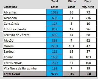 Por concelhos, os números totais no Médio Tejo desde o início são os seguintes: Abrantes (1035 casos – 740 recuperados); Alcanena (693 – 426 recuperados); Constância (127 casos – 89 recuperados); Entroncamento (857 – 656 recuperados); Ferreira do Zêzere (430 – 186 recuperados); Mação (366 – 202 recuperados); Ourém (2281 – 1285 recuperados); Sardoal (122 – 80 recuperado); Tomar (1650 – 895 recuperados); Torres Novas (1527 – 837 recuperados); Vila Nova da Barquinha (191 – 125 recuperados).