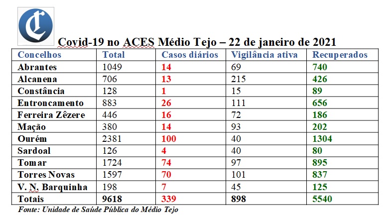 Por concelhos, os números totais no Médio Tejo desde o início são os seguintes: Abrantes (1049 casos – 740 recuperados); Alcanena (706 – 426 recuperados); Constância (128 casos – 89 recuperados); Entroncamento (883 – 656 recuperados); Ferreira do Zêzere (446 – 186 recuperados); Mação (380 – 202 recuperados); Ourém (2381 – 1304 recuperados); Sardoal (126 – 80 recuperado); Tomar (1724 – 895 recuperados); Torres Novas (1597 – 837 recuperados); Vila Nova da Barquinha (198 – 125 recuperados).