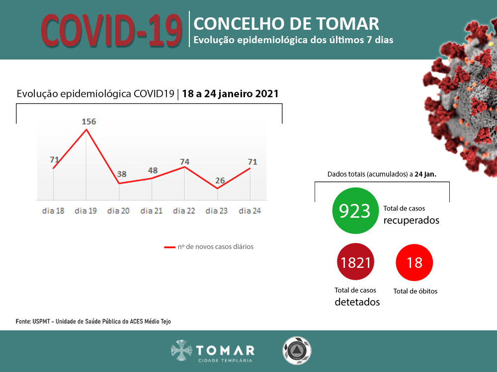 A situação epidemiológica evolui de forma desfavorável no concelho de Tomar. Os últimos sete dias marcam a pior semana de pandemia no concelho que contabiliza 484 novos casos de infeção com o novo coronavírus, mais 118 que na semana antecedente. O maior aumento diário de infeções desde o início da pandemia registou-se na passada terça feira com 156 testes positivos à Covid-19.