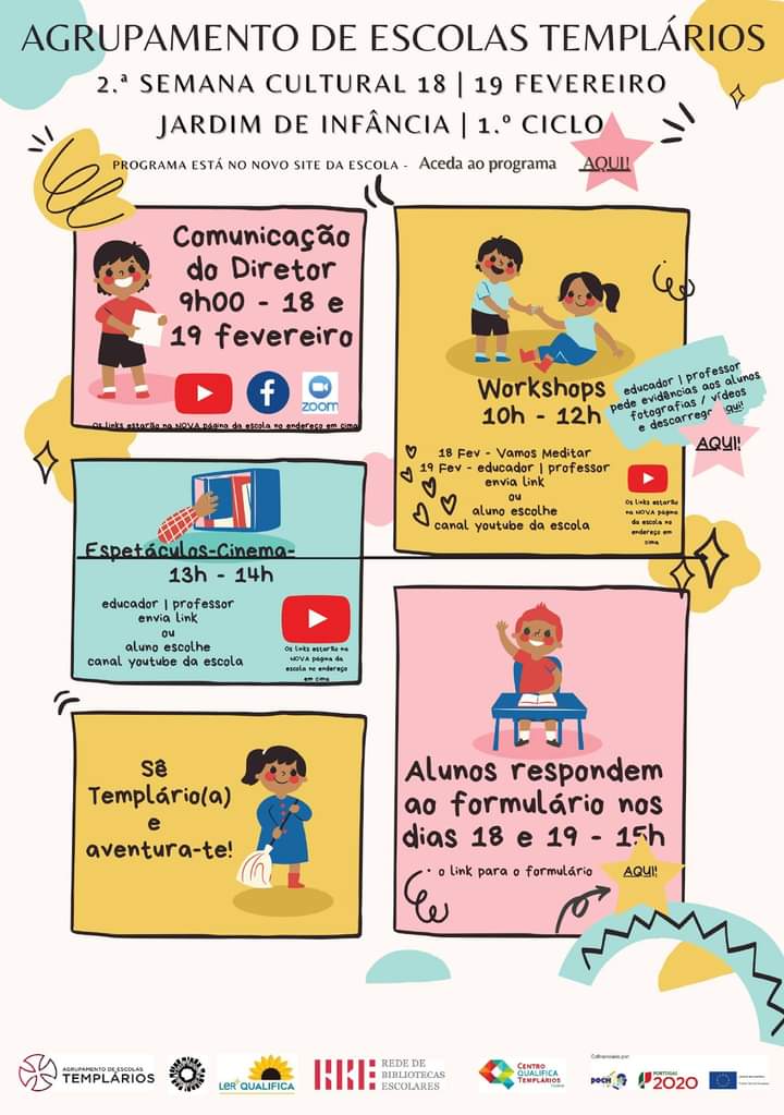 A segunda Semana Cultural do Agrupamento de Escolas Templários, iniciativa no âmbito do Plano Nacional das Artes e que conta com a parceria do Município, desenrola-se amanhã e quinta-feira, em formato online mas com uma vasta oferta de workshops, espetáculos, cinema e apresentação de livros.