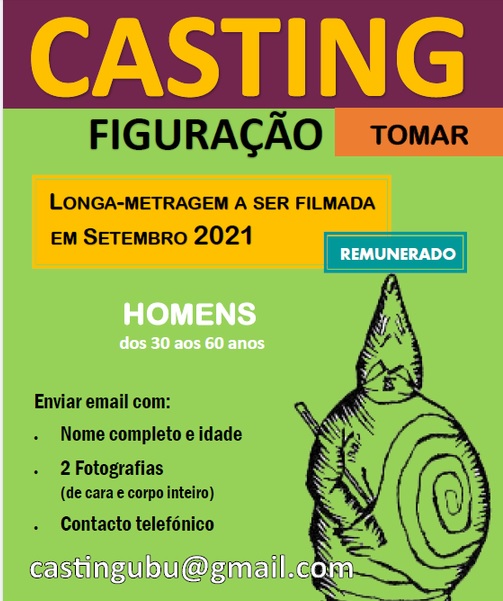 O casting de figuração para o filme ”UBU” está quase a chegar ao fim, mas a produção continua à procura de homens altos (1,80m e 1,90m de altura) entre os 30 e os 60 anos para soldados. Os interessados terão que enviar nome completo e idade, 2 Fotografias (de cara e corpo inteiro) e contacto telefónico, para o email: castingubu@gmail.com. Este trabalho será remunerado.