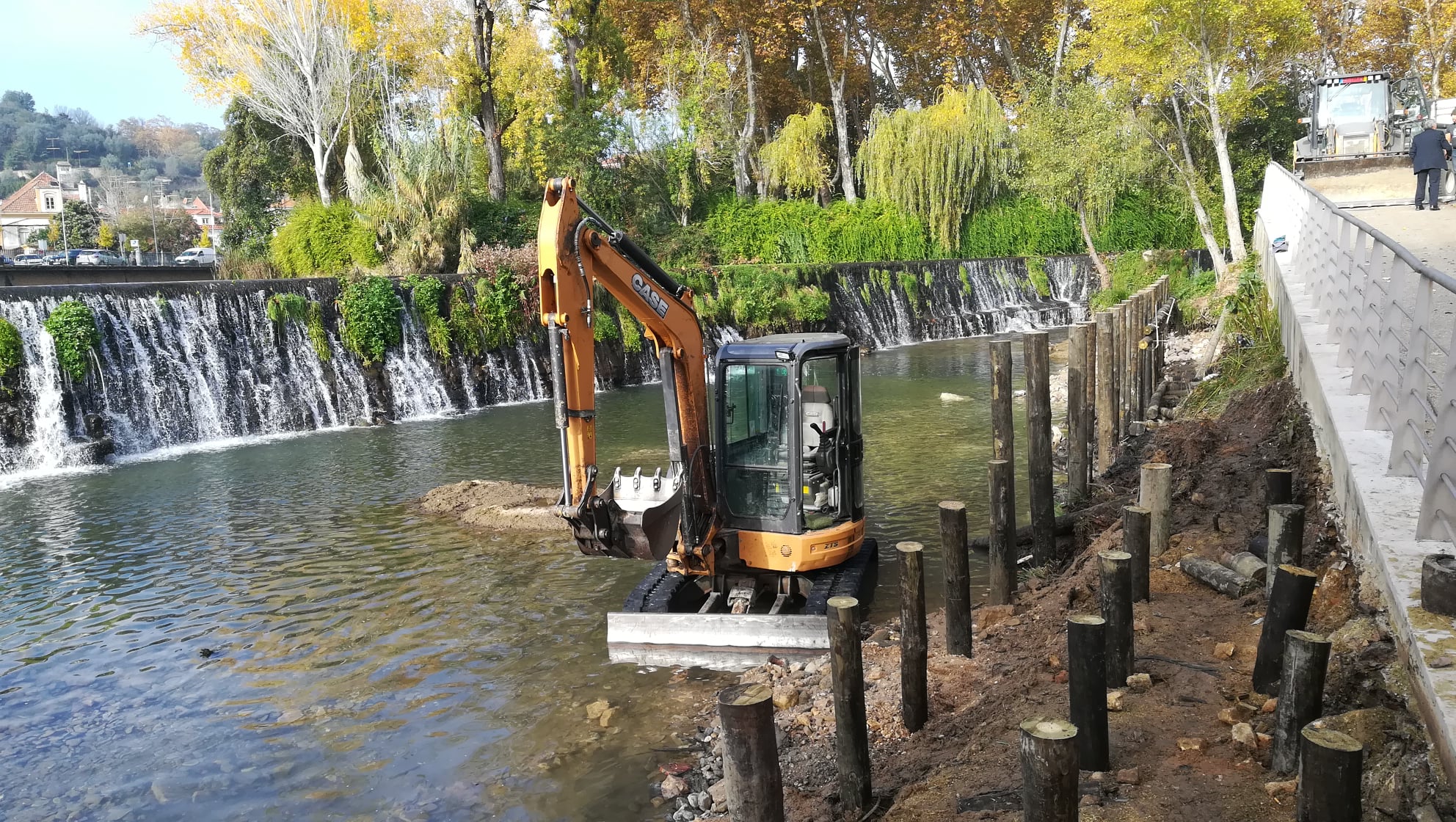 Os trabalhos consistem na cravação de uma fiada de estacas de madeira de pinho tratado, ligadas entre si por três fiadas de troncos de madeira, conferindo uma maior solidez ao conjunto, A envolver a estacaria, será colocada uma camada de pedra de enrocamento que dissipará a energia da corrente das águas e servirá de reforço estrutural à muralha do rio.
