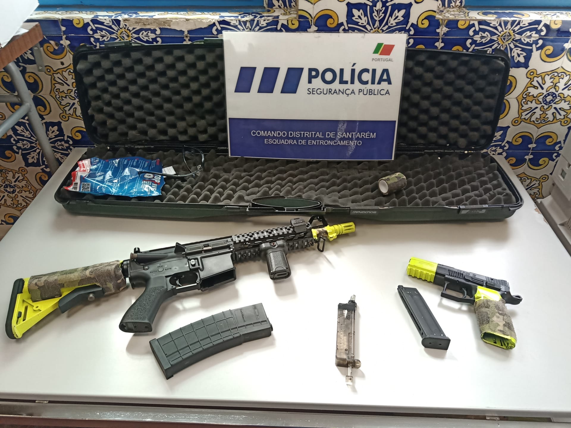 No cumprimento do mandado de busca domiciliária foram apreendidas duas armas de airsoft.