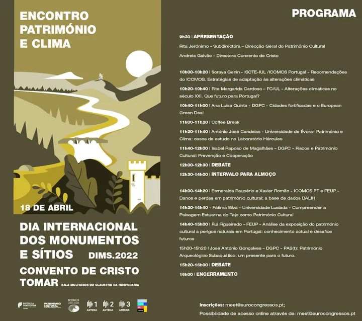 Para assinalar este Dia realiza-se o Encontro “Património e Clima”, que ocorrerá em 18 de abril de 2022 no espaço privilegiado do Convento de Cristo, em Tomar. Atendendo ao tema definido pelo ICOMOS – Conselho Internacional dos Monumentos e Sítios – este Encontro contará com a presença de vários especialistas que se debruçarão sobre a forma como o impacto da emergência climática – que afeta todos os domínios da vida e da sociedade – se reflete, com especial destaque, no património cultural.