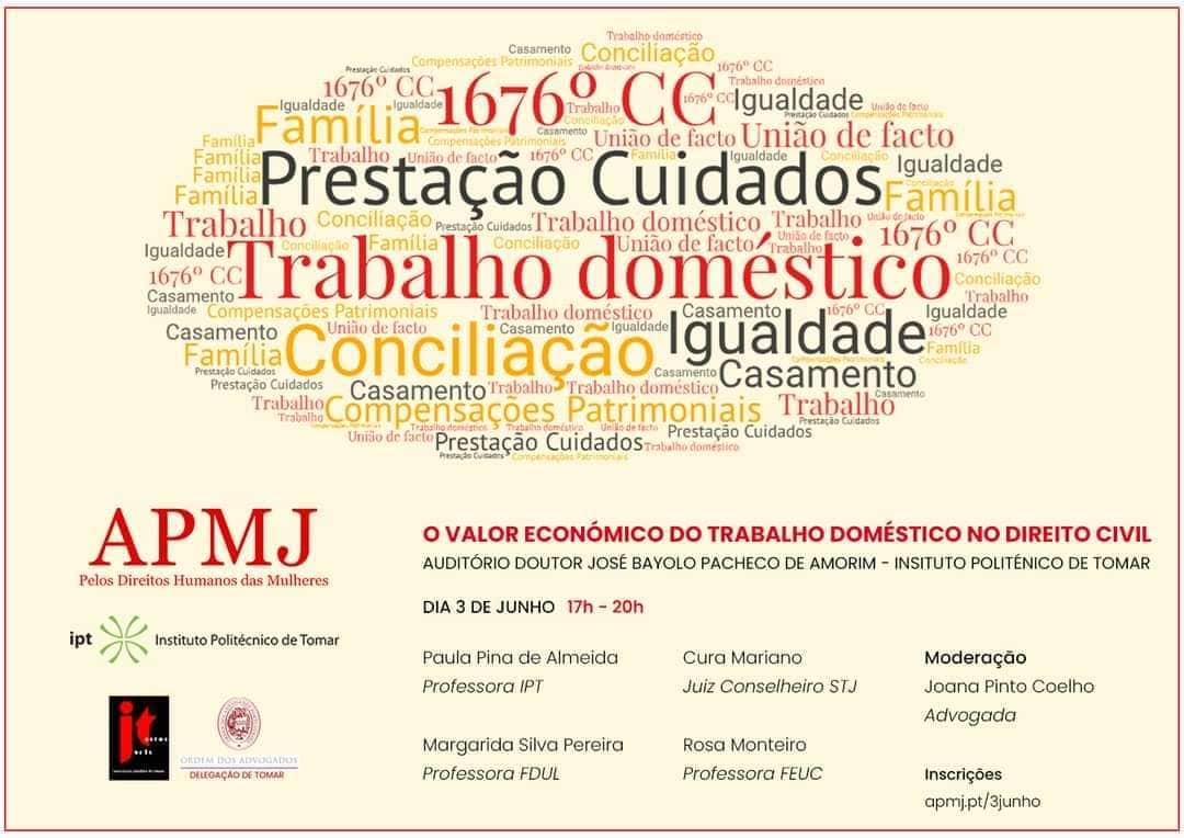 Tem lugar na sexta-feira, 3 de junho, entre as 17h e as 20 h, no Auditório do Instituto Politécnico de Tomar, o Colóquio “O valor económico do trabalho doméstico no direito civil”. organizado pela Associação dos Direitos Humanos das Mulheres (APJM).  A sessão, moderada pela advogada Joana Pinto Coelho, conta com intervenções de Paula Pina de Almeida (Professora no IPT), Cura Mariano (Juiz Conselheiro STJ), Margarida Silva Pereira (Professora FDUL) e Rosa Monteiro (Professora FEUC). As inscrições decorrem em https://apmj.pt/3junho