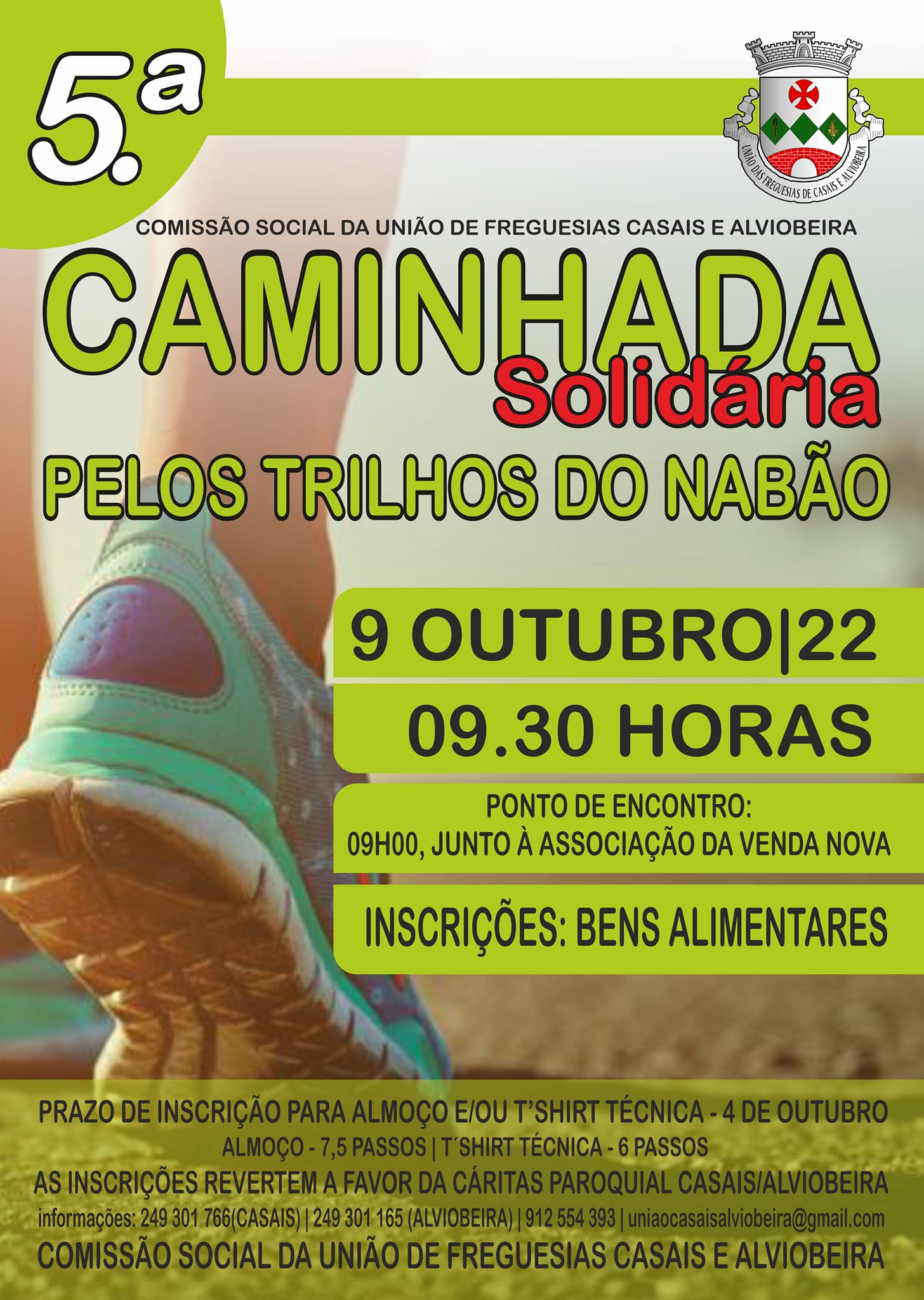 Com saída da Venda Nova, junto do Centro de Dia, pelas 9h30, do dia 9 de outubro (domingo), e com inscrição composta por bens alimentares, a Comissão Social da União de Freguesia de Casais/Alviobeira promove mais uma “caminhada, para o qual a junta de freguesia apela à inscrição e marcação ou não do almoço. As inscrições revertem para a Comissão Social desta União de Freguesias.