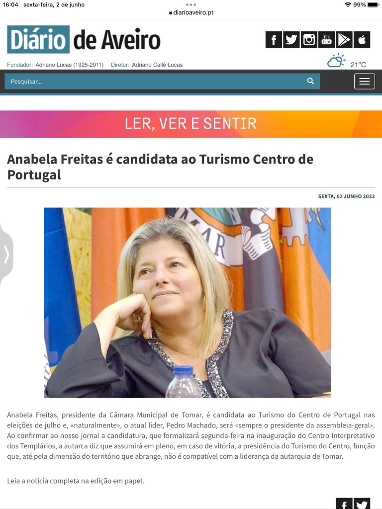Ao mesmo jornal, Anabela Freitas disse ainda ser sua intenção anunciar a candidatura, na próxima segunda feira, na inauguração do Centro Interpretativo dos Templários, assim como referiu que, caso vença, “assumirá em pleno a presidência do Turismo do Centro”, função que não é compatível com a liderança da Câmara de Tomar.
