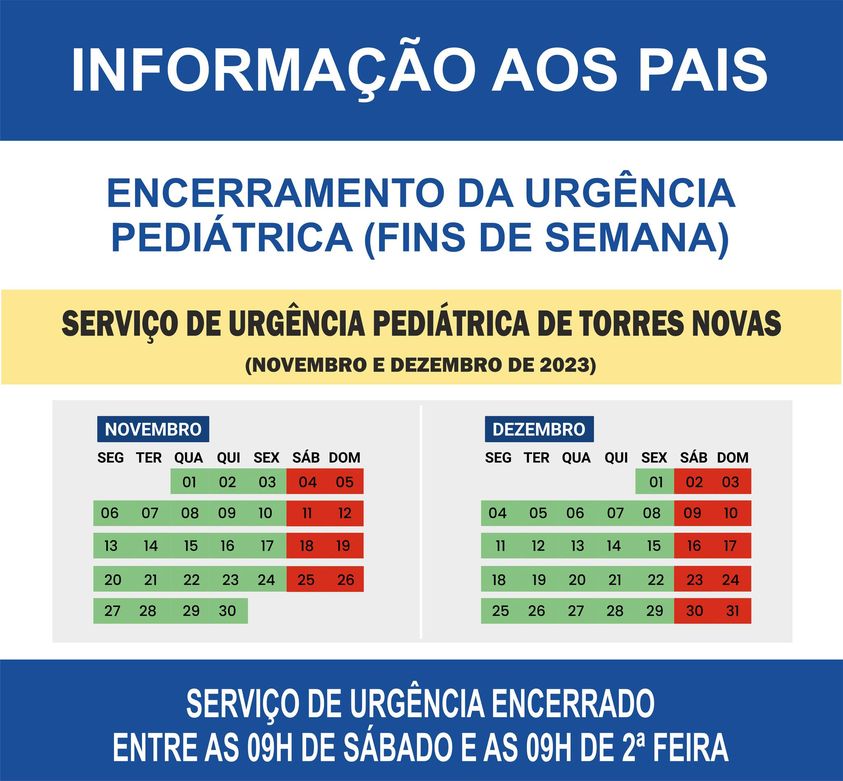 Tal como anunciado, o Serviço de Urgência Pediátrica da Unidade de Torres Novas do Centro Hospitalar do Médio Tejo (CHMT) vai estar em situação de contingência planeada este fim de semana, entre as 9h00 de dia 25 de novembro e as 9h00 de dia 27 de novembro.