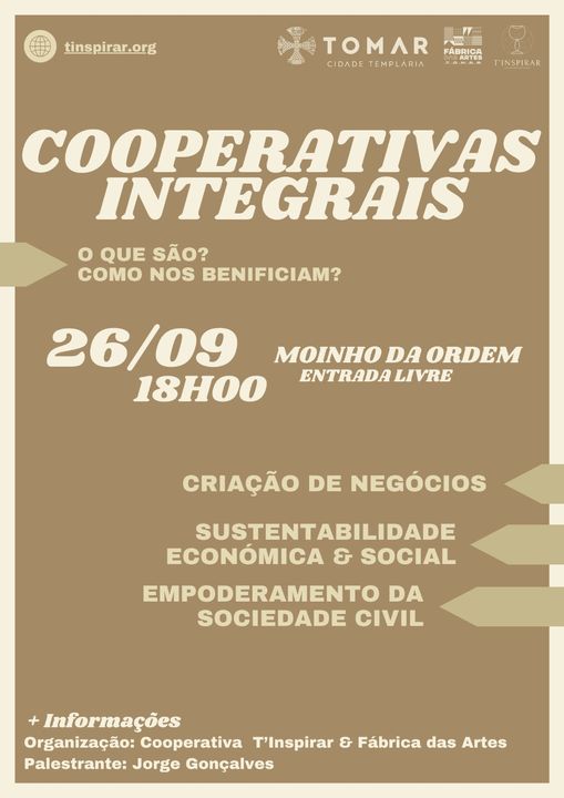 A Cooperativa Integral T’Inspirar, em parceria com a Fábrica das Artes | Tomar, irá promover no dia 26 de setembro, quinta-feira, às 18h00, a palestra “Cooperativas Integrais – o que são e como beneficiam a criação de negócios locais e projetos sociais”.