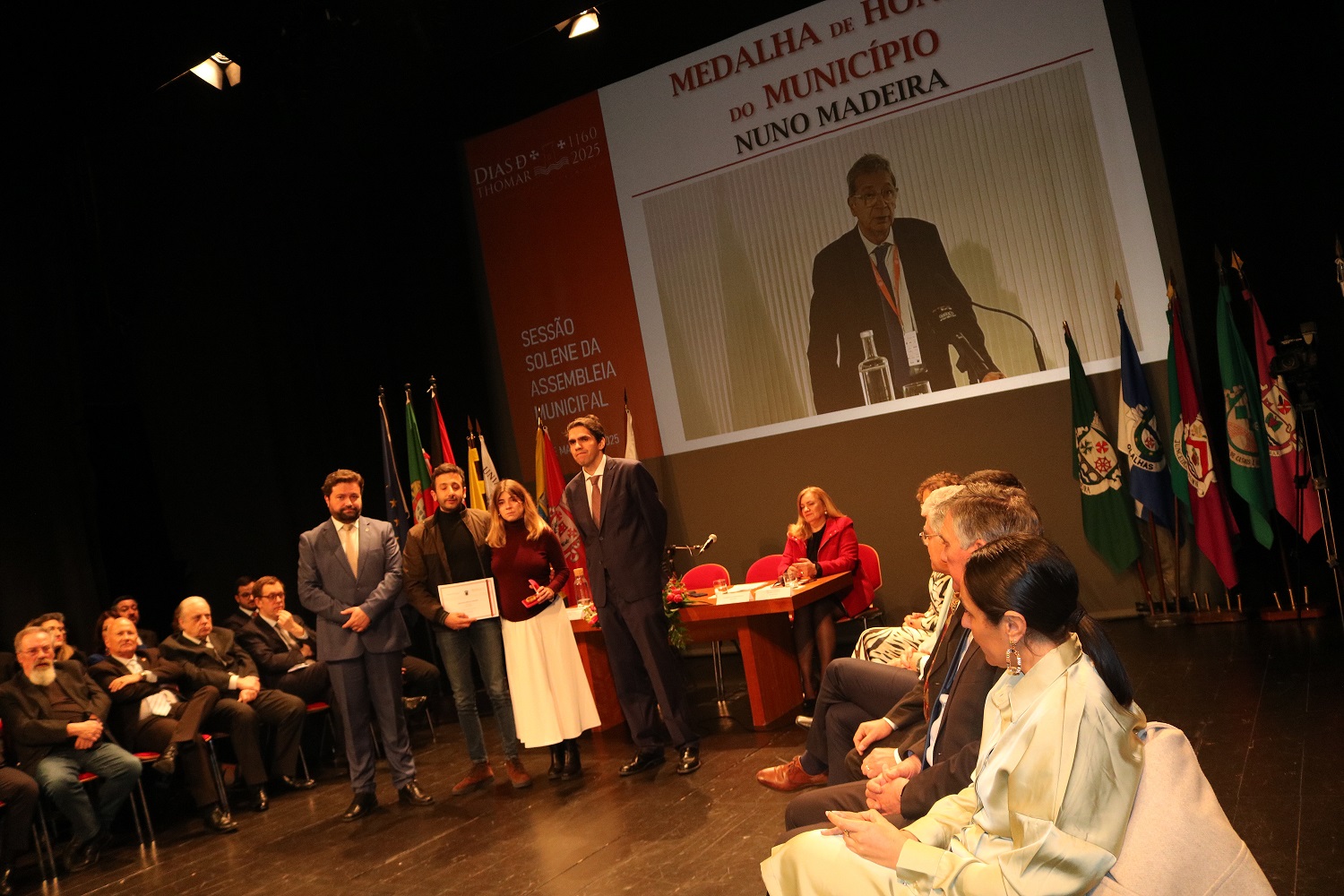 A homenagem a Nuno Madeira, professor e vice-presidente do Instituto Politécnico de Tomar, concedida a título póstumo, foi um dos momentos mais emocionantes da sessão solene da Assembleia Municipal de Tomar, que decorreu na manhã de sábado, 1 de março, Dia da Cidade. A cerimónia decorreu, como habitualmente, no Cine-Teatro Paraíso, onde se encontravam diversos convidados, entre os homenageados e seus familiares. Natural de Carregueiros, Nuno Madeira era, à data da sua morte (29 de dezembro de 2024), professor do IPT, para onde entrou em 1986, e vice-presidente da instituição. Foram os filhos que subiram ao palco para receber a medalha, agradecendo ao município esta homenagem. Os discursos dos homenageados que subiram ao palco também foram marcados por alguma emoção, como foi o caso dos discursos dos representantes do Restaurante Beira Rio e de Júlia Quadros e José Morgado, entre outros.