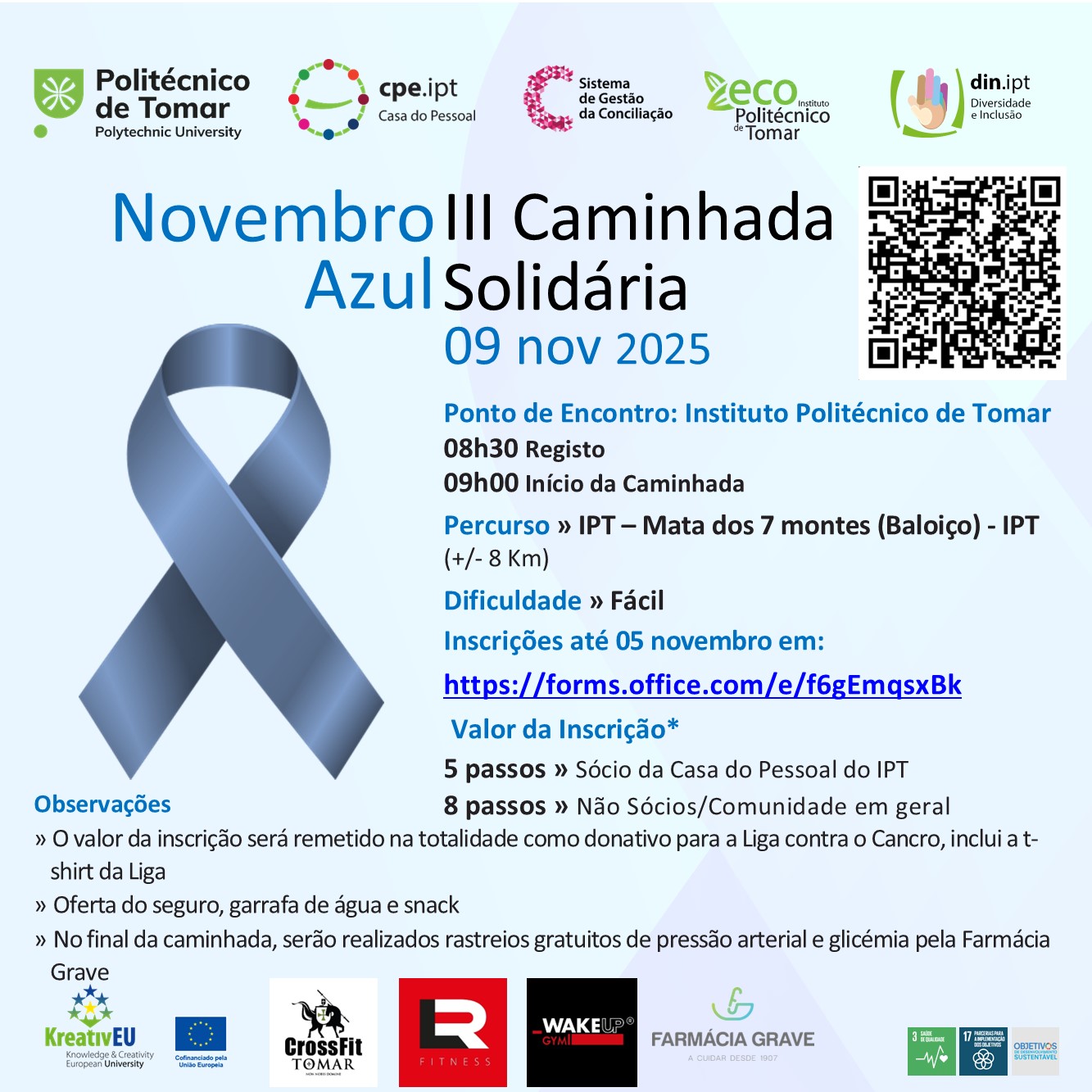 A Casa do Pessoal do IPT, em parceria com o Instituto Politécnico de Tomar, promove no próximo dia 9 de novembro de 2025 a III Caminhada Solidária, dedicada este ano ao “Novembro Azul” — uma iniciativa que tem como objetivo sensibilizar a comunidade para a saúde masculina e a prevenção do cancro. O ponto de encontro está marcado para as 08h30, nas instalações do Instituto Politécnico de Tomar. O percurso, com cerca de 8 quilómetros, ligará o IPT à Mata dos 7 Montes (Baloiço) e terá grau de dificuldade fácil.